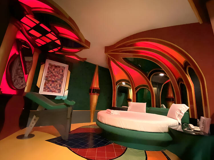 ห้องพักที่กระจกโอบล้อมคุณไว้รอบด้าน เปิดมุมมองแบบ 360 องศา ให้ทุกกิจกรรมสนุกๆ ถูกสะท้อนกลับมาอย่างเต็มตา ดีไซน์เรโทรแบบจัดเต็ม รายละเอียดแน่นทุกอณู พร้อมไอคอนหญิงสาวสุดคลาสสิกที่แอบมองจากผนัง (จะมองว่าเซ็กซี่ขี้เล่น หรือชวนขนลุกนิดๆ ก็แล้วแต่มุมมอง) แต่สิ่งที่ชัดเจนคือ บรรยากาศโดยรวมยังคงความเย้ายวนแบบคลาสสิก คุมโทนได้ดี ไม่หลุดไปทางเชยหรือเยอะเกินพอดี