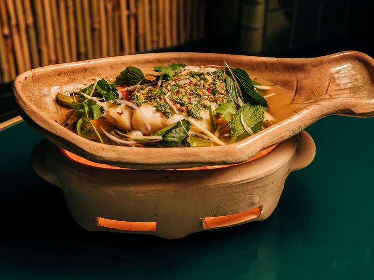 The food: The menu is inspired by the culinary traditions of Southeast Asia and the foods Dang and managing partner Amarit Dulyapaibul ate growing up. Standouts include the bird's eye chili and hamachi crudo, which is served on a green fish-shaped plate, the chargrilled sugarcane beef bo la lot wrapped in betel leaves and the clay pot lobster pad Thai.