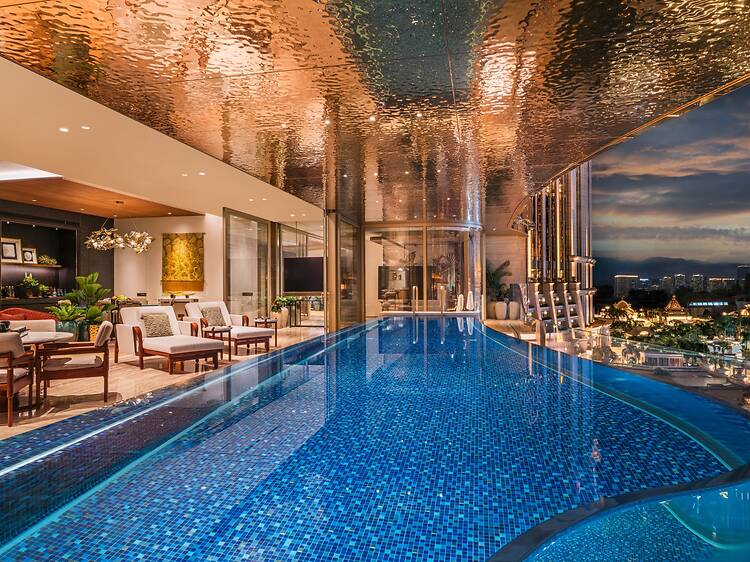 This Capella also boasts the largest hotel rooms in southern China. Two- and four-bedroom penthouses offer sun rooms, outdoor terraces, and glass-walled outdoor private infinity pools. (The four-bedroom penthouses, spanning close to 7,530 square feet, even come with a soundproofed movie and karaoke room, and its own gym complete with an OSIM massage chair.) There’s no need for the property itself to have a large pool on a communal deck because each suite comes with its own private pool anyway. Even the smallest one- and two-bedroom suites start at around 1,380 square feet and feature indoor relaxation jacuzzi pools, sunbeds, and Amazonite marble bathrooms.