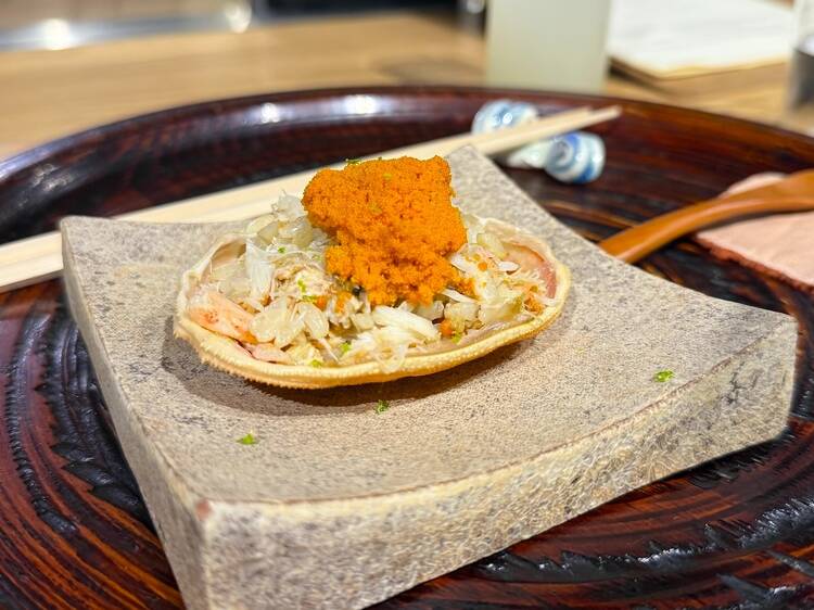 A meal here might begin with a minimalist preparation of steamed Hokkaido hairy crab—the meat carefully removed and mixed with white rice, plopped back into the shell with a mound of bright orange roe. Since opening, Kojima-san has scaled back on sushi, but you can still expect a few types of sashimi, plus a variety of fried and grilled dishes. On my most recent meal, I enjoyed slices of grilled mackerel topped with chives, plus another crab course topped with daikon radish and ikura; the seasonal fungi was also featured in the gohan course. I cannot tell you what you’ll have on your visit; even from week to week, the chef swaps out dishes and ingredients, freely remixing elements of kaiseki into an array of edible wonders without ever straying too far from the fundamentals of Japanese cooking.