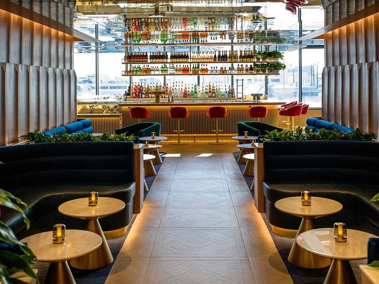 The lounge features a full-service bar offering a selection of cocktails, including the "British G 'n' Tea" and a pick 'n' mix candy station offering both British and American faves. First Class passengers have access to the exclusive Concorde Dining Room, where they can enjoy upscale meals and unlimited Pommery Cuvée Louise champagne. Additional amenities include shower suites and runway views, enhancing the overall waiting experience.
