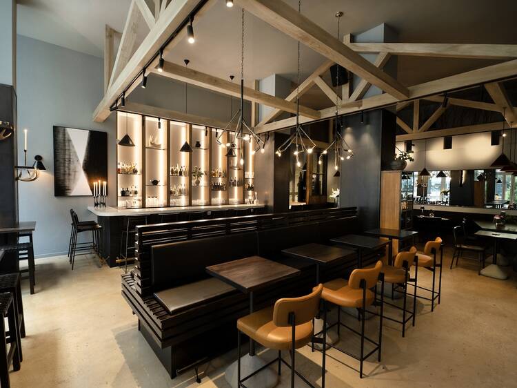 While indicated by the name, Kabin isn't a cozy winter cabin run by your cheugy, mountainous friends. Instead, the sleek Norwegian cocktail lounge reads like an Airbnb retreat that's on your dream list. With tall ceilings anchored by white-washed wooden beams and elements of steel, the drinking den comes to life at night, illuminated by soft lighting behind the bar and handsome fixtures on the ceiling that sprout like tree roots. But sleek doesn't mean cold, as tucked-away corners hide leather chairs, furry pillows, and blankets ready to receive you.