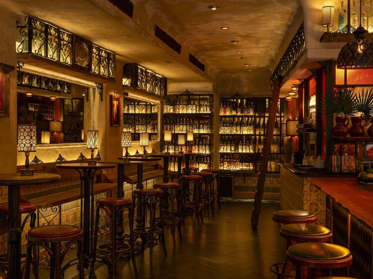 Housed in a landmark building dating back to the 1600s, the newest Mexi takes inspiration from the colonial homes of Mérida, Yucatán. Patterned tiles line the walls and the bar, while commissioned artwork nods to Catholic iconography. Mezcal and tequila double as decor as wrought iron gates partition off a rows of illuminated bottles.