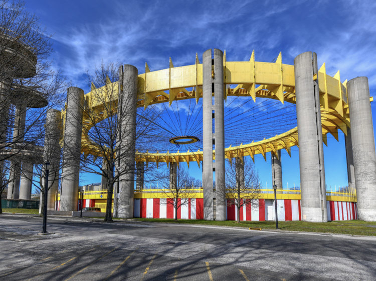 If you know the structure from pop culture, you know it as the “alien spaceship” from 1997’s Men in Black. (They were the three Jetsons-esque observation towers that looked like they were a button-push away from lifting off.) If you know it from New York history, you know it as Philip Johnson’s retro-futurist “Tent of Tomorrow,” built to embody the World’s Fair promise of “man’s achievement on a shrinking globe in an expanding universe.”