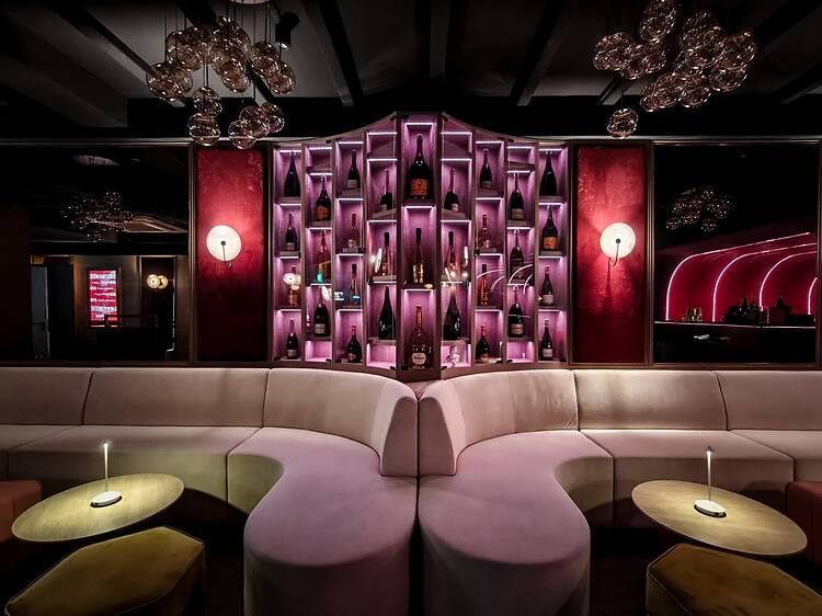 You enter through the deli, brushing past trays of focaccia and the coffee machine, before meeting with a crimson red door. Behind it lies a lowly-lit lounge decked out with statement checkered floors, gold details and LED screens. You can tell it's a space meant for partying, with the DJ booth positioned in the centre, flashy pink light strips around the bar counter and rows of low tables by the sides.