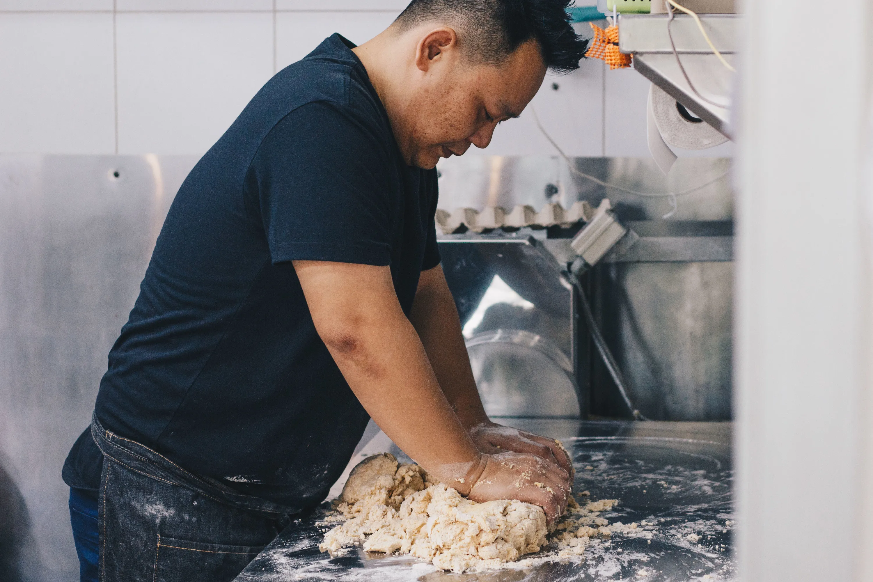 He straps on an apron and dusts off his metal workspace – it’s time to make a batch of his signature noodles. Over a dozen eggs are added to flour and kneaded by hand, the mixture is pressed over itself, layer after layer, until it forms a smooth dough that’s cut into soft, silky strands.