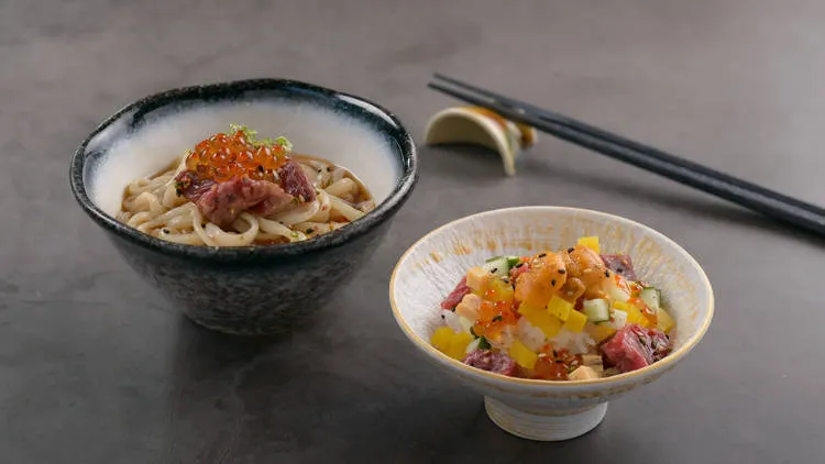 Equally premium, and enjoyable, is the rare Sanuki wagyu. Raised on a diet of olive peels, the meat from the fine cattle comes as part of the shabu shabu course, and yields a buttery bite that almost melts in the mouth. The next course of Furano wagyu comes marinated with sweet shoyu and torched for a kiss a smoke. Choose to have it either as chirashi don, mixed with ikura, uni, tamago, radish, and zucchini; or slurp it down in the form of chilled Inaniwa udon. Then, to round off the journey through various wagyu varieties, the meal ends with some clean, briny clam soup to cut through the richness, and a seasonal fruit platter with dainty sweet treats.