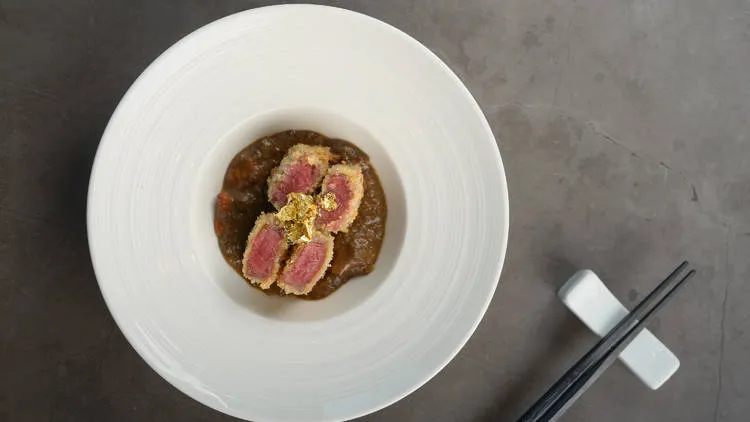 Away from the fatty cuts, the meal also presents a lean Iwate steak katsu, deep-fried with breadcrumbs till medium-rare. These meaty parcels provide a firm, hearty bite, and are accompanied by a spice-scented curry stew cooked with beef, coffee, red wine, and minced beef.