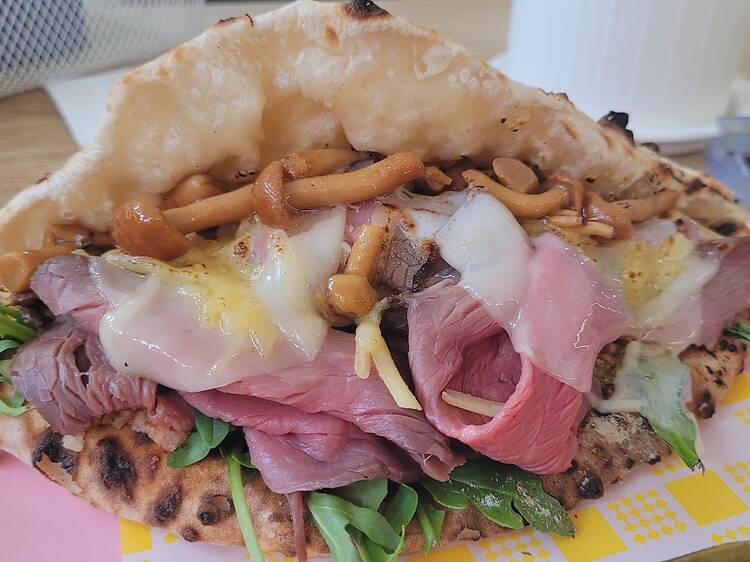 The pizza bread is dreamy – a thousand hours of study and experimentation has resulted in something that’s light and airy, soft, with char marks from the wood fire, and a subtle salty kind of sourness from the fermentation. But it’s their fillings I’m really obsessed with. My favourite combo is the beef ozzo ($21). The bread wallet comes jammed with thin strips of rare roast beef with the glossiest shimeji mushrooms, melted cheddar and provolone, grilled capsicum and rocket, served with a big gherkin. There’s something about this combo of fillings that your tastebuds hold onto – I can still taste the butteriness of the mushrooms with the gooey cheese and salty beef.
